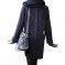 A crewneck coat with zip and a leather detail on the pockets, combined with black trousers.